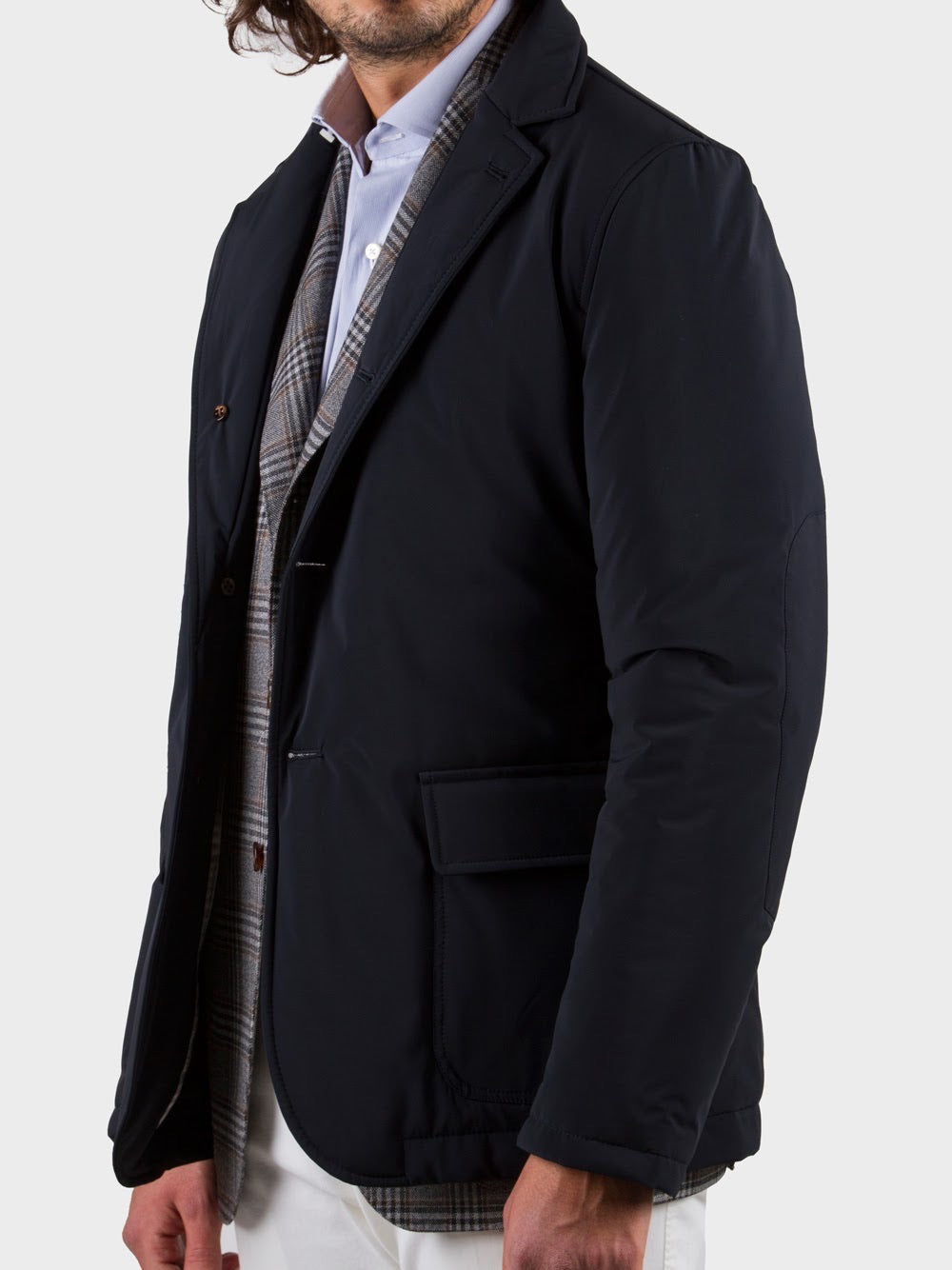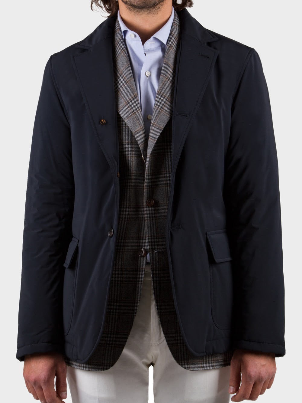 95% вискоза, 5% полиуретан - прорезные накладные карманы с клапанами - коричневые пуговицы corozo на подкладке Рост модели 1,83 см, размер одежды 48